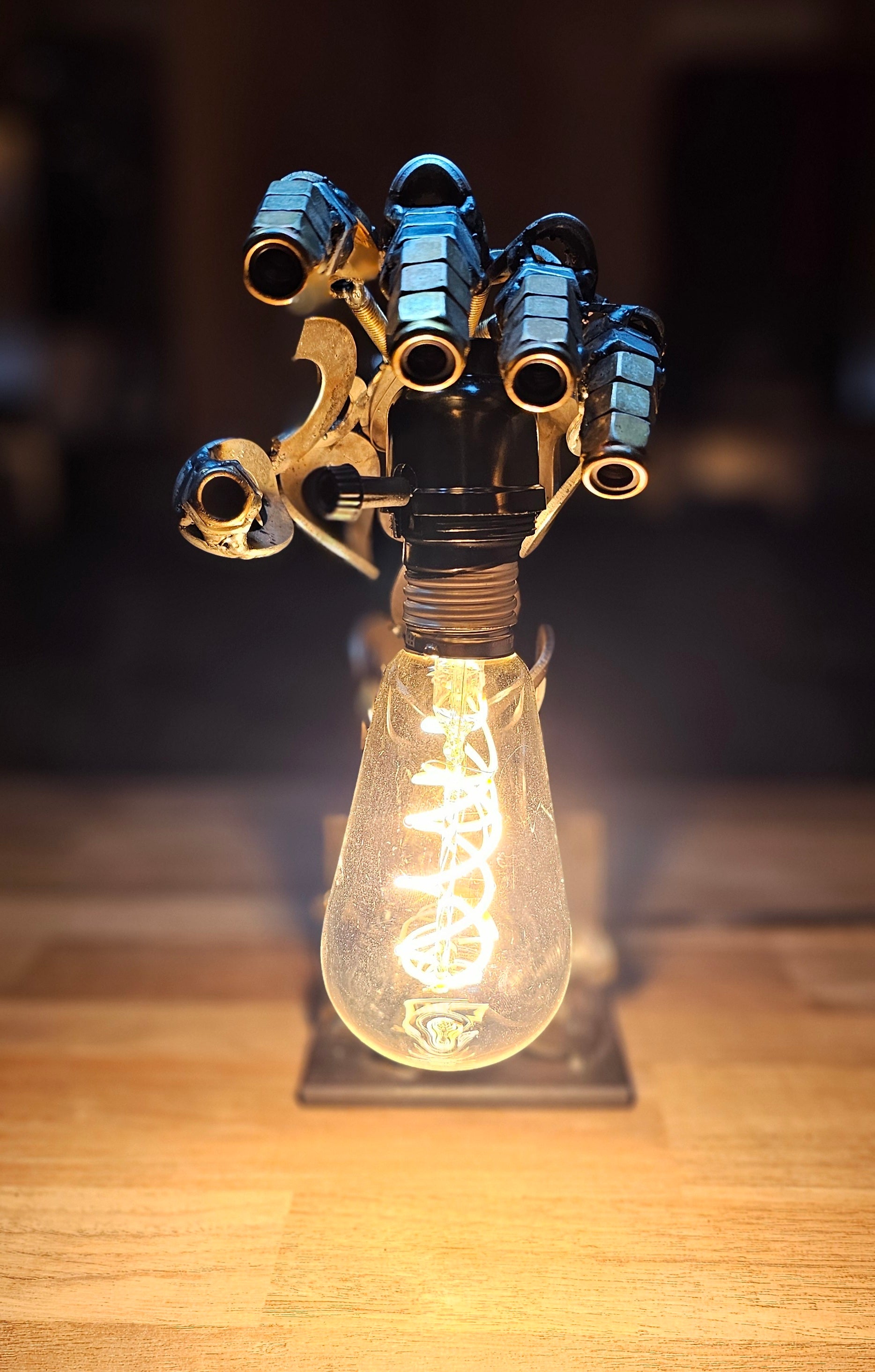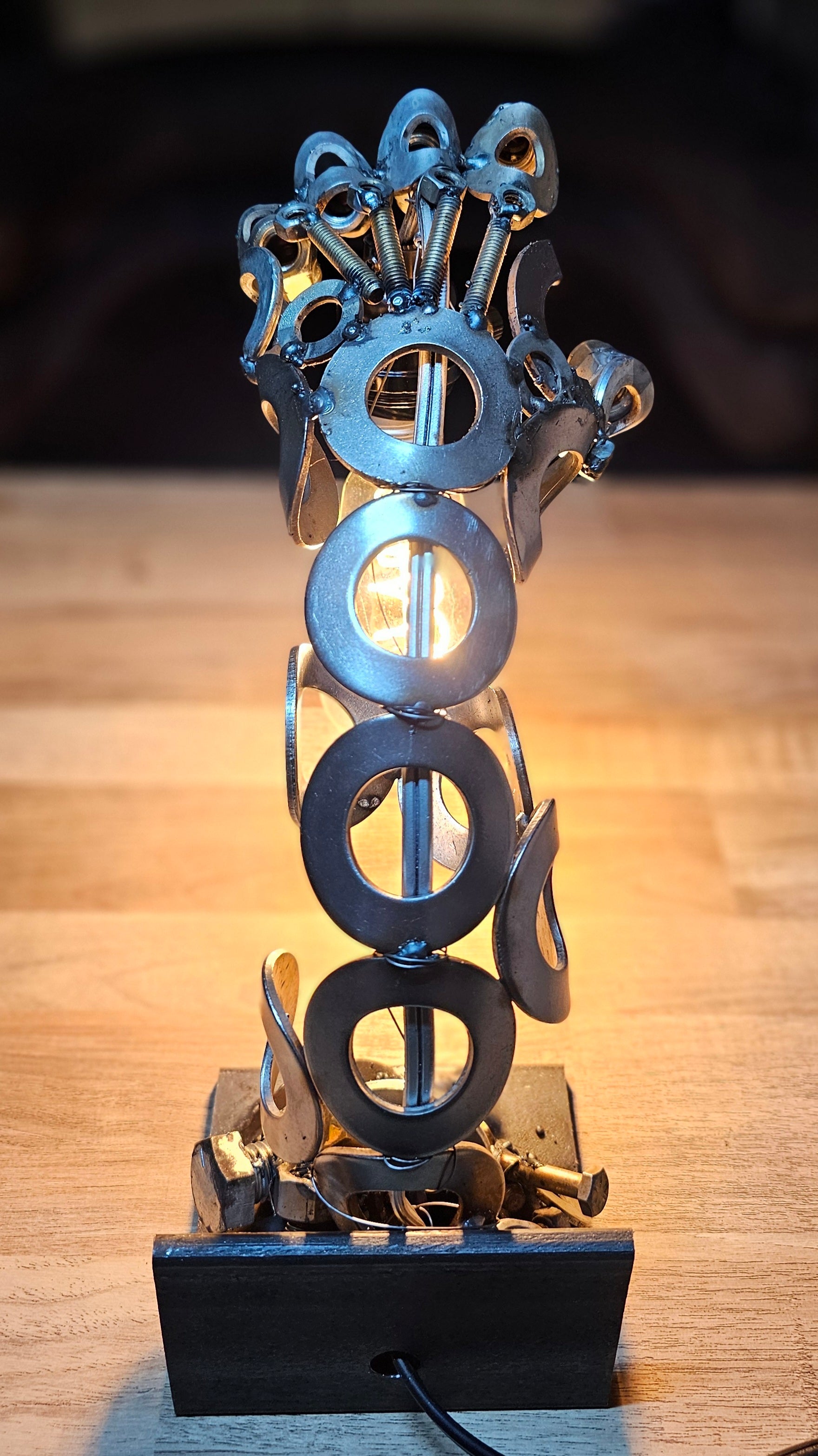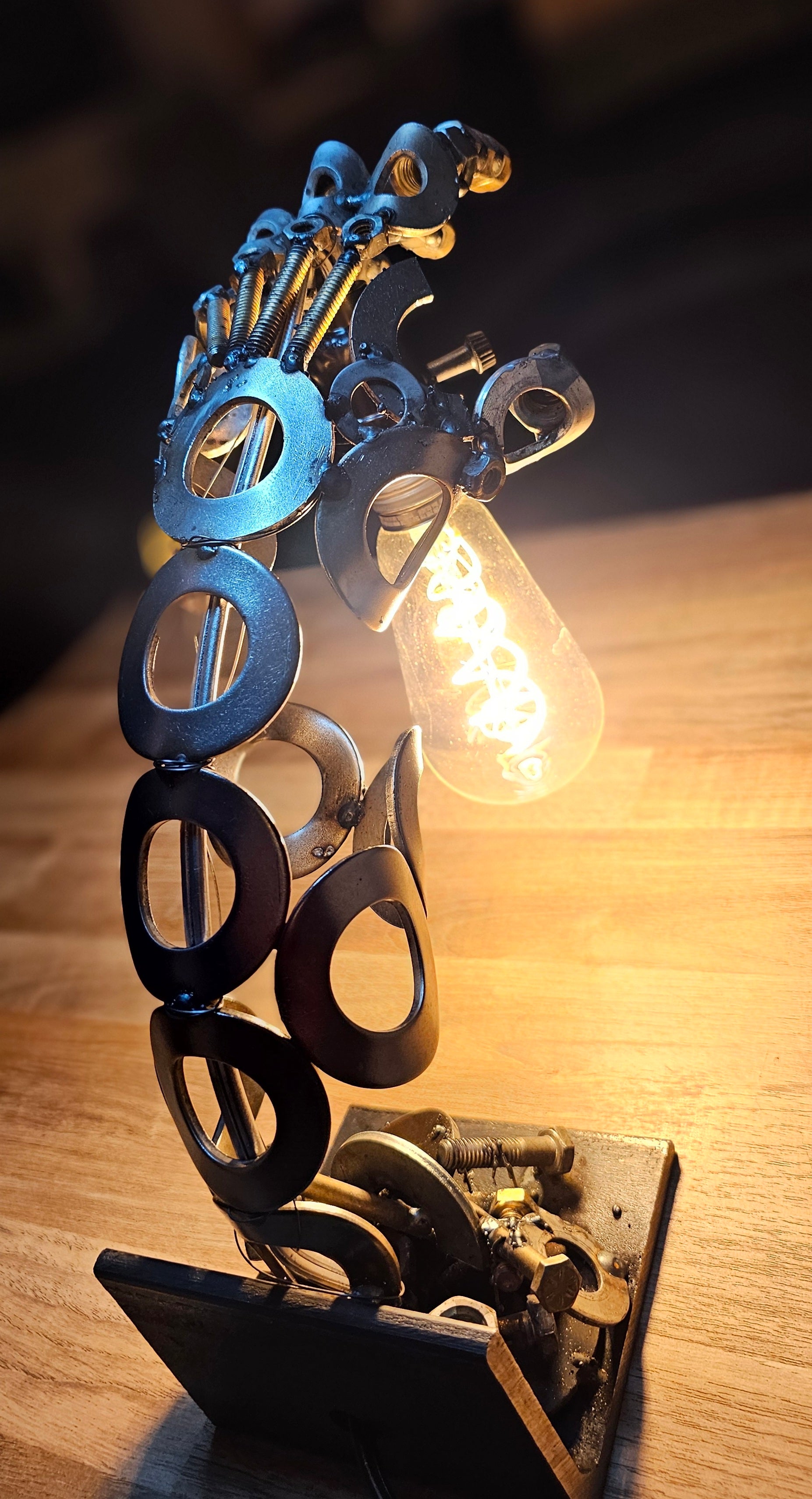 The Palm Of Light is a one-of-a-kind hand sculpture crafted from recycled nuts, bolts, washers, and other metal components. This elegant piece artistically holds a floating light bulb, combining industrial materials with refined design. Ideal as a statement decor or unique lighting feature, it brings a blend of craftsmanship and creativity to any space. Light bulb included.